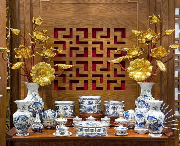 Bộ thờ men lam vẽ vàng giúp không gian thờ thêm sáng, trang trọng, và linh thiêng.